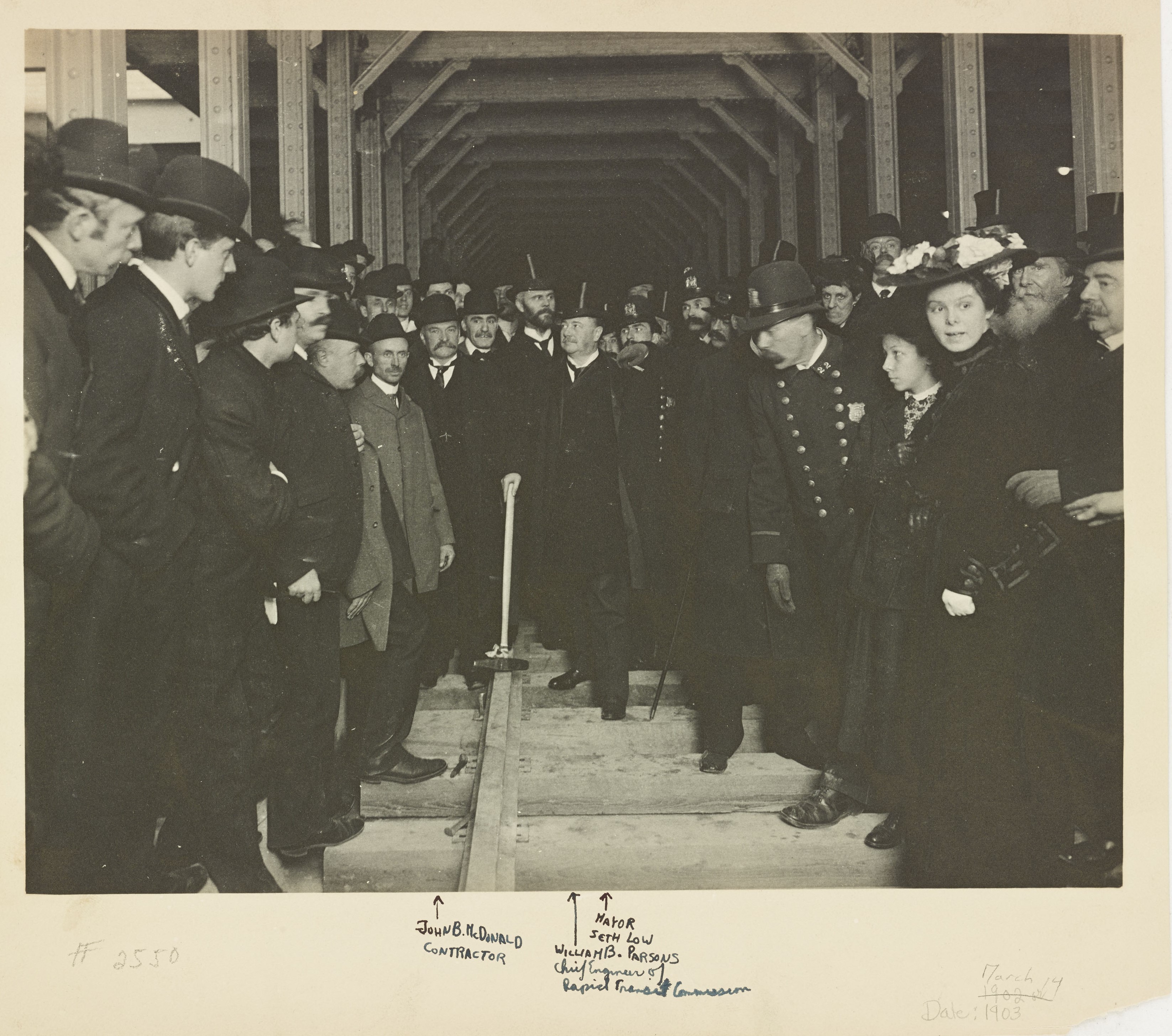 Contractor John B. McDonald, Mayor Seth Low, Chief Engineer of Rapid Transit Commission William B. Parsons, and other dignitaries hammer in the last spike in the first subway tunnel. New York City subway service officially began on October 27, 1904. Municipal Archives collection, NYC Municipal Archives.
