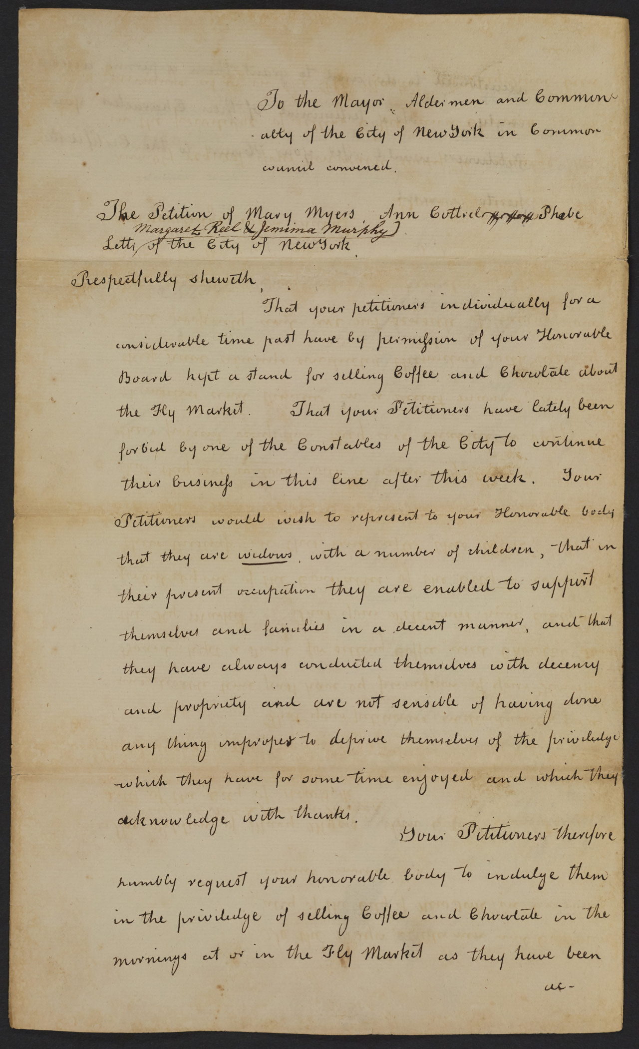 Page 1: To the Mayor Aldermen and Commonality of the City of New York in Common councilconvened.The Petition of Mary Myers, Ann Cottrel, Phebe Letts, Margaret Reel & Jemima Murphy of the City of New York Respectfully sheweth, That your petitioners individually for a considerable time past have by permission of your Honorable Board kept a stand for selling Coffee and Chocolate about the Fly Market. That your Petitioners have lately been forbid by one ofthe Constables of the City to continue their business in this line after this week. Your Petitioners would wish to represent to your Honorable body that they are widows with a number of children, that in their present occupation they are enabled to support themselves and families in a decent manner, and that they have always conducted themselves with decency and propriety and are not sensible of having done any thing improper to deprive themselves of the priviledge[privilege]which they have for some time enjoyed and which they acknowledge with thanks. Your Petitioners therefore humbly request your honorable body to indulge them in the priviledge [privilege] of selling Coffee and Chocolate in the morning at or in the Fly Market as they have been.